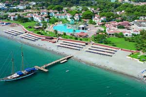 До Антальи 45 минут ехать, до ближайшего поселка Чамьюва минут 15 идти (выходите из отеля, поворачиваете направо, потом еще раз направо, ориентир - отель Симена, напротив Симены начинаются торговые ряды, кафешки, аптеки и пр.) Об отеле можно сказать, Территория большая, зеленая, очень ухоженная, много всякой живности - черепахи, ящерки, кошки. Про муравьев в номерах не верьте, их там нет, а вот тараканы, большие и черные, попадаются:)) Вообще в Кемере очень красиво - горы, сосны, алеандры... глаз отдыхает!!! Про номер могу сказать: Если особо не придираться номера нормальные. На вторых этажах не так сыро как на первых. А вот с сантехникой беда, поэтому запаситесь отверткой и ключом, потому что помощи от персонала ждать будете долго. За 15 уе можно получить номер с видом на море. Слышимость в номерах отличная, поэтому на ночь лучше оставлять работающий кондер, он так гудит что ничего другого не будет слышно:)) Сервис в отеле: Персонал приветливый, по русски если не говорит то точно понимает:) За 1 уе вам сменят постельное белье, а вот полы помоют вряд ли... Про питание: Питание достаточно разнообразное, кому не нравится острая национальная кухня может найти привычные макароны, рис и картошку. Каждый день на гриле готовят что-то новое - рыбу, индейку, катлетки из баранины и пр. Очень вкусная пицца с морепродуктами. Самих морепродуктов правда мало, только рыба и кальмары в салате. Есть диетический стол. Из фруктов дают арбузы, дыни, но за ними огромные очереди. Про активный отдых: Водные виды спорта с этого года платные, за исключение каное. Волейбольную площадку засыпали песком, так что играть нормально. А так спортивные развлечения на любой вкус - теннис (бесплатно), дайвинг, степ, аквааэробика, белиданс Развлечения в отеле: Анимация жжот. Вечерняя программа расчитана на 20 дней, так что повторения вы не увидите. Порадовало то что анимация не навязчивая. Никто не хватает за руку и не тащит играть в бочу или дартс. Обо всех мероприятиях объявляют заранее. Не хочешь не идешь. А захочешь присоединиться - будут всегда рады. Несколько советов и рекомендаций: - не берите экскурсии в отеле, выйдите за территорию, не бойтесь, никто вас не кинет, это не в их интересах. Например цена рафтинга в отеле 40 дол., за территорией 15 дол. - отель не работает по системе ультра олл, ненадо требовать от барменов мартини и текилу - бесполезно. Спиртное разбавляют жутко, пить не возможно, хотите "отъехать" берите раке, ее не разбавляют потому что она сразу мутнеет:)) Самый популярный напиток виски-кола, если понравитесь бармену виски нальет больше колы:)) - девчонки, если не хотите тесно общаться с местным населением, не ездите на дискотеки за пределами отеля. А если есть такое желание, пожалуйста, раз в неделю аниматоры вывозят народ в Инферно, так же можно поехать в Ауру. - фрукты можно купить за территорией, выходите и налево. - любители верховой езды, не верьте отельным гидам из Мостревела, верховая езда есть!!! Опять же берите экскурсию за территорией, 20 уе в час, но это того стоит - поедете в горы, лошади отличные, послушные, не забудьте стырить морковки с диетического стола:)) - в помукалле ездить не рекомендуем, экскурсия затянутая, а само помукалле уже не то что на открытках, все пересохло, в бассейне клеопатры яблоку упать негде, а по хиерополису бродят толпы туристов:)) - кальян в отеле стоит 10 до